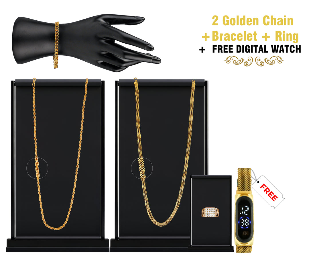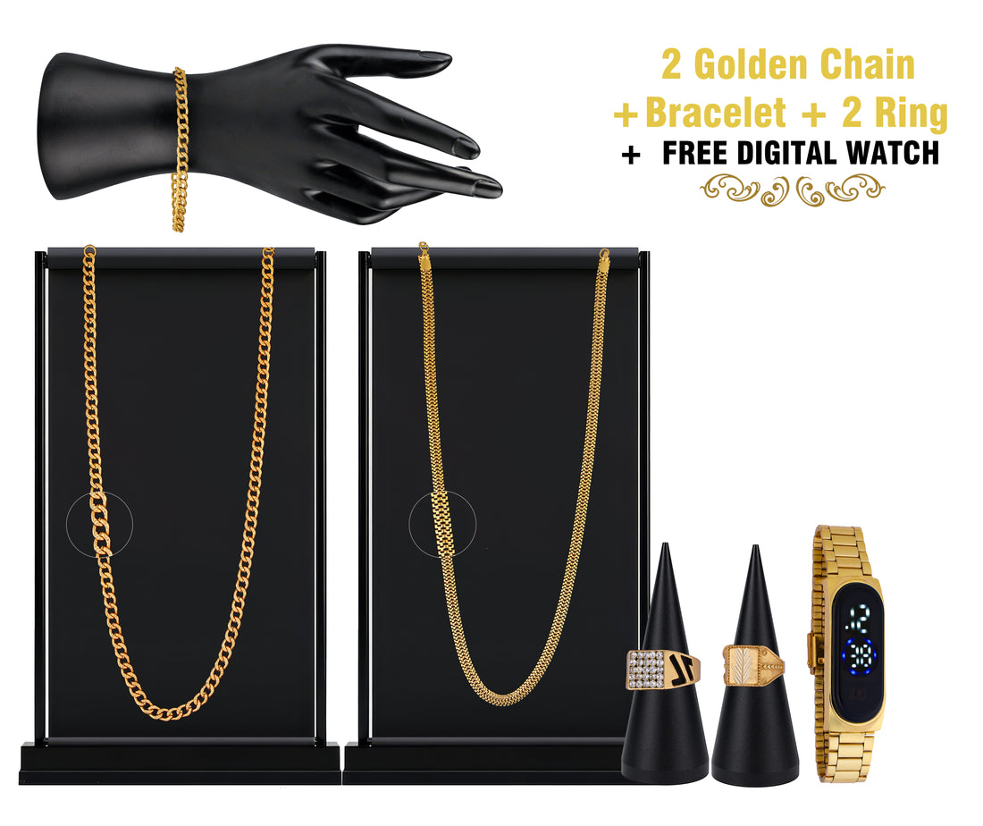 Combo of 2 Golden Chain + Bracelet + 2 Ring + Digital Watch