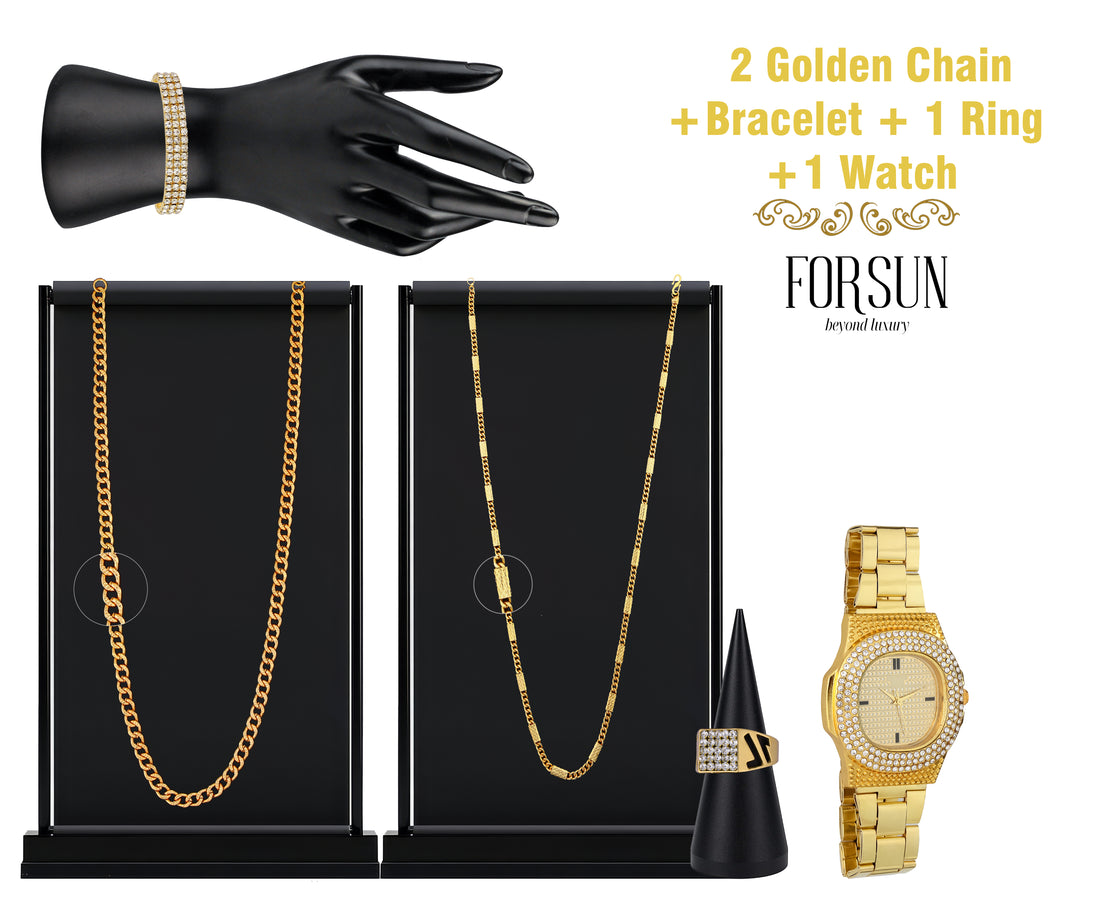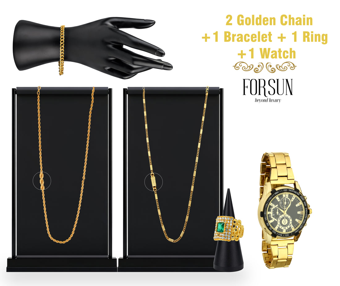 Combo of Golden Watch + 2 Golden Chain + Bracelet + Diamond Ring