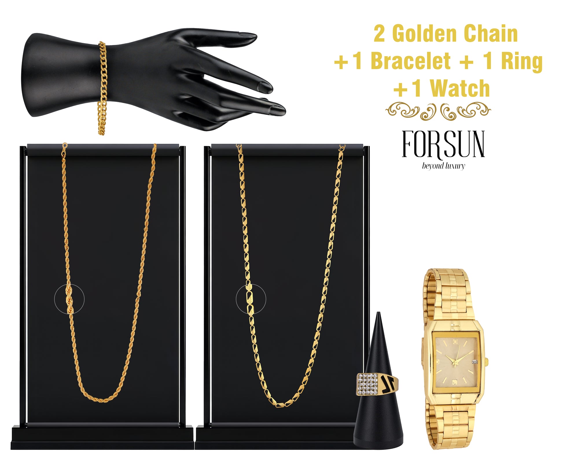 Make a bold statement at all your special occasion with Men's Golden Watch that comes with 2 Golden chain, bracelet and a Austrian Diamond Ring and that too absolutely free. Made from high quality material, the watch is a perfect example of style and elegancy. Also, the golden chain comes with classy look and style that will enhance the overall look. The combo is perfect for gifting purposes as well.