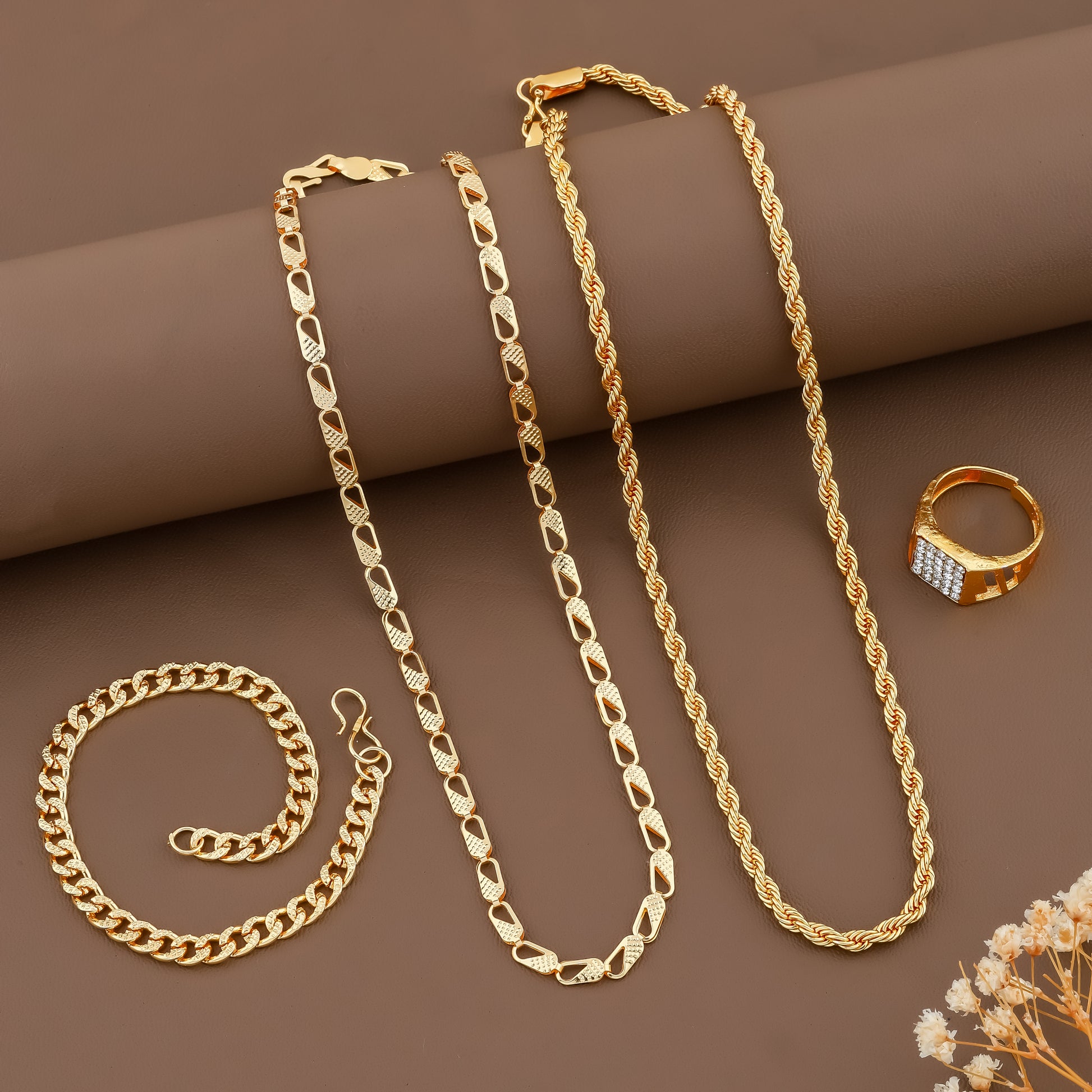 Combo of Golden Watch + 2 Golden Chain + Bracelet + Diamond Ring