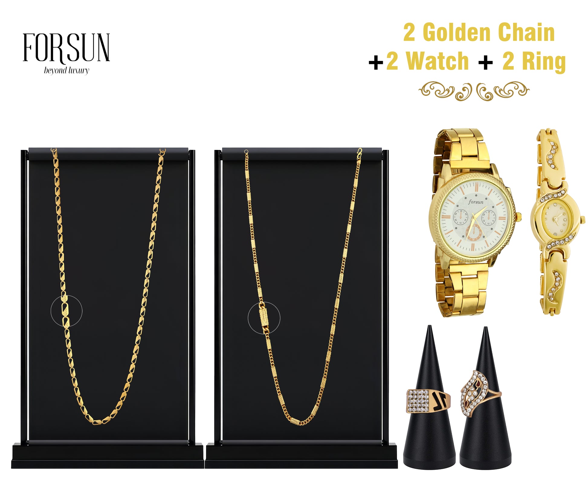 Blockbuster Deal combines a golden watch with Austrian diamonds, two stylish golden chains, a golden bracelet, and a golden ring to offer a complete luxury set. Designed to add elegance to any look, each piece reflects timeless beauty and sophistication.
