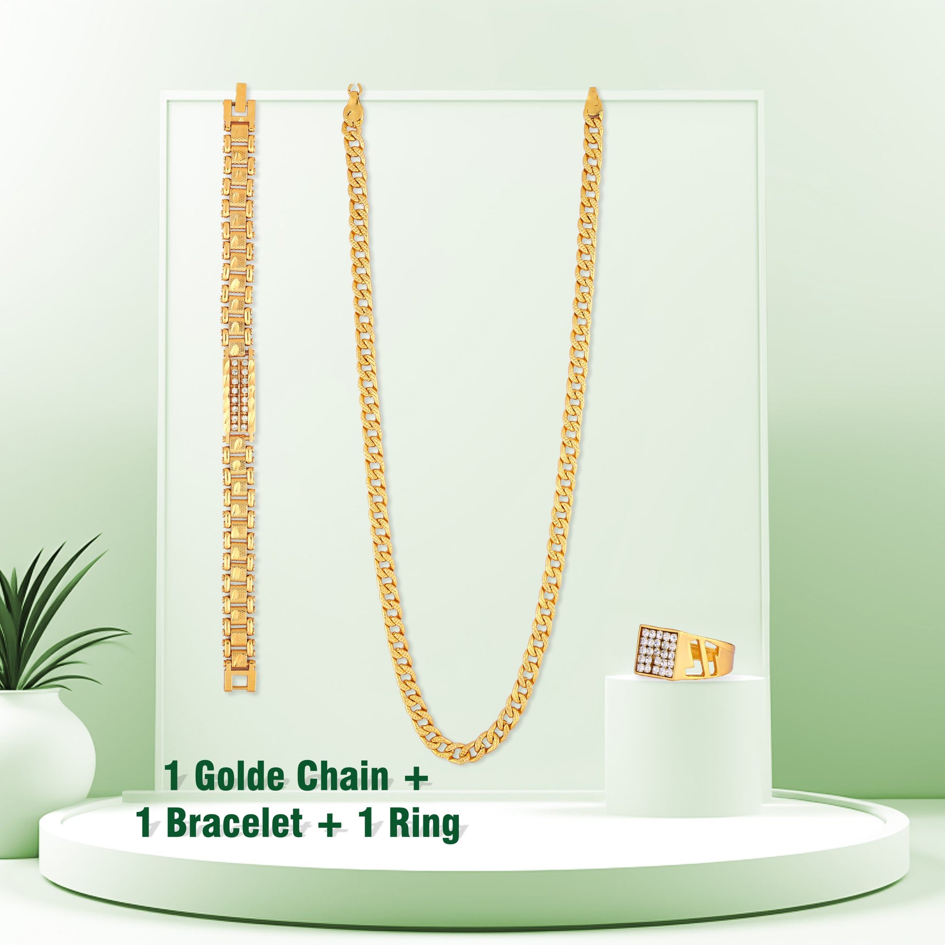 This elegant combo features a finely crafted golden chain, a matching bracelet, and a dazzling diamond ring.